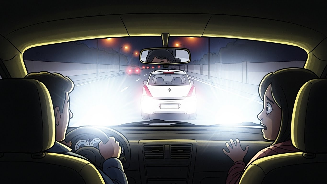 We were on the Old Madras Road now, the stretch that gets quieter after you pass the main commercial area. Fewer cars. Darker streets. The Swift stayed right behind us, headlights flooding our car with harsh white light. The horn just kept going—one long, continuous blast that made my teeth ache.