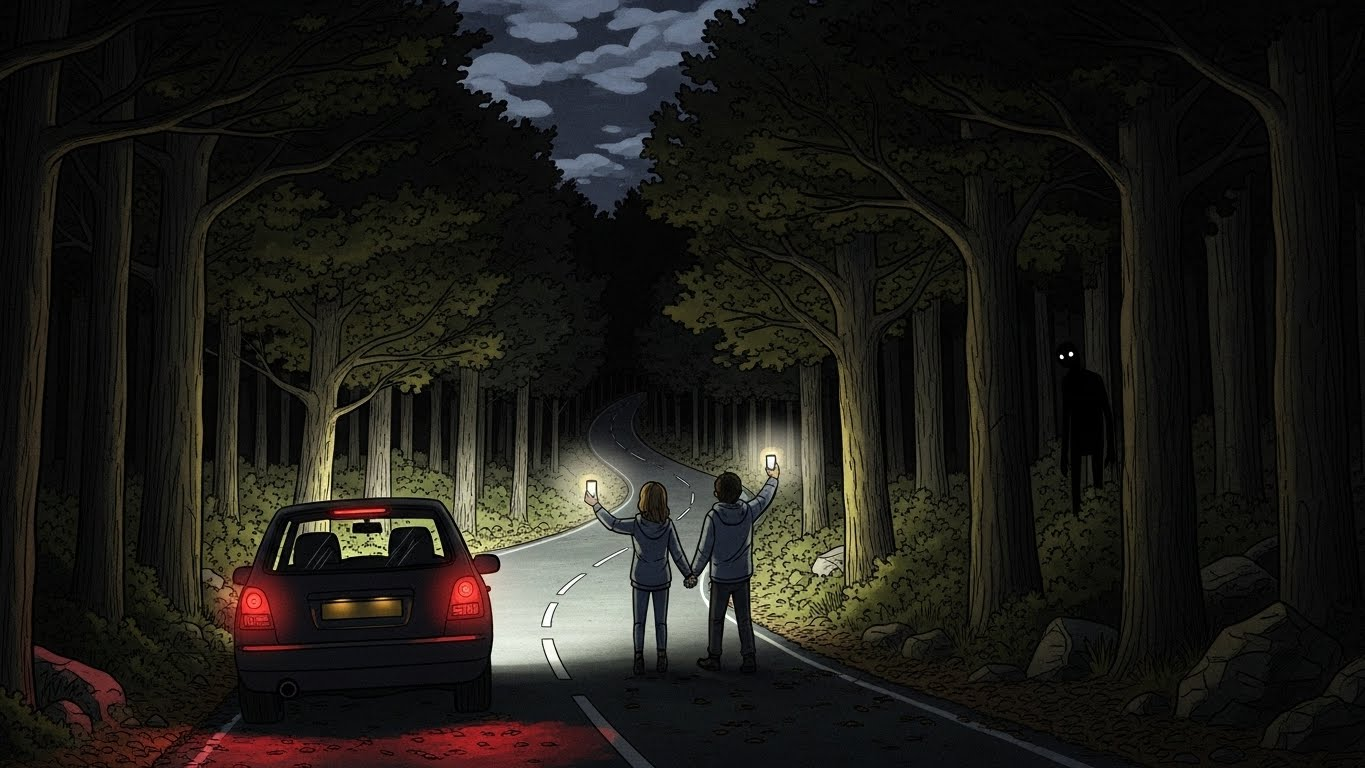 The engine died completely, and she managed to coast us onto a narrow lay-by before everything went dark. And I mean dark. No streetlights, no houses, nothing. Just trees pressing in on both sides of the road, thick and endless.