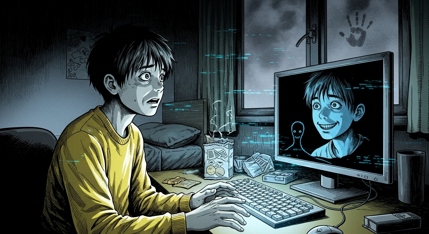 For a second, Luka thought it was just lag. He’d been gaming for six hours straight, lights off, blinds drawn, the pale glow of the monitor painting his face ghost-white. His room smelled faintly of pizza crusts and the dust that gathers behind old computer fans. But that wasn’t what made his stomach twist. It was the reflection staring back at him from the black screen—smiling.