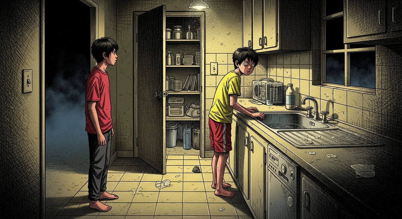 No answer. Varun just stared, still as a statue. Aarav blinked. When his eyes reopened, the boy was gone. The kitchen light stayed on.