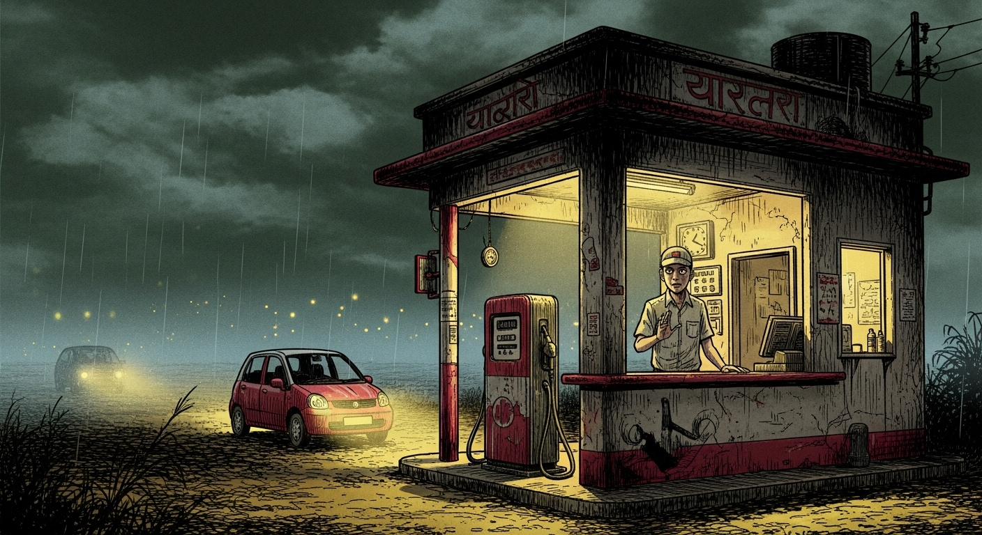 When the fuel light blinked on, they pulled into the nearest gas station—a tiny place with a single pump and a faded sign that flickered like a tired candle.