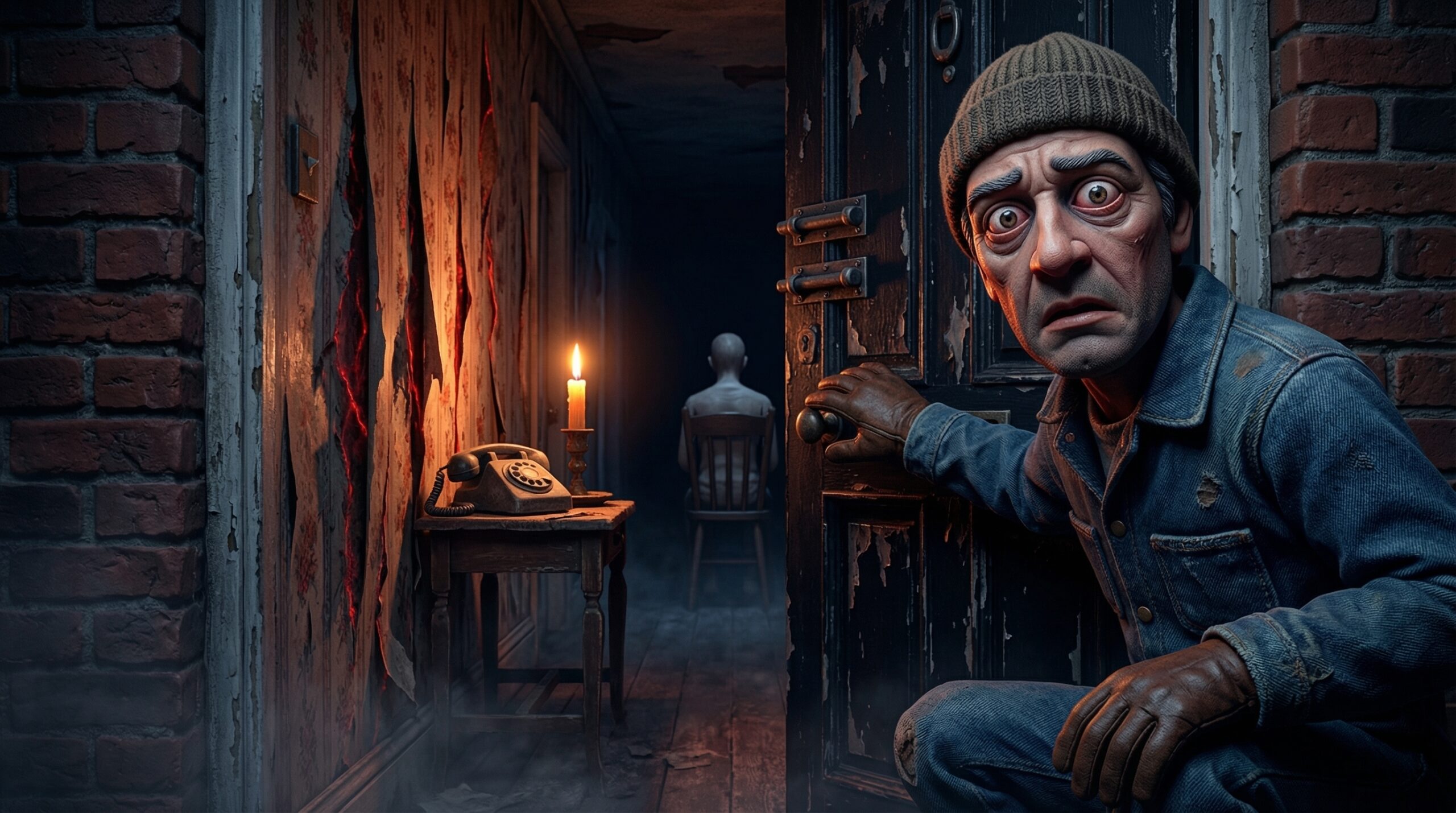 The hallway was dark. Curtains drawn throughout, what little light came in showed a narrow corridor, wallpaper peeling in long tongues from the walls, a telephone table with a rotary phone still sitting on it. Everything coated in a uniform grey dust, like the whole interior had been preserved in ash.