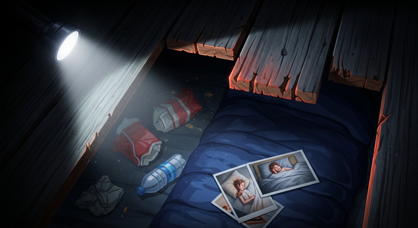 There was a crawlspace down there. Maybe three feet high, extending into darkness. And directly below where I was kneeling: a sleeping bag. Navy blue, the expensive kind. Next to it, a neat stack of food wrappers—Tesco sandwiches, crisps, energy bars. A plastic water bottle. And a torch.